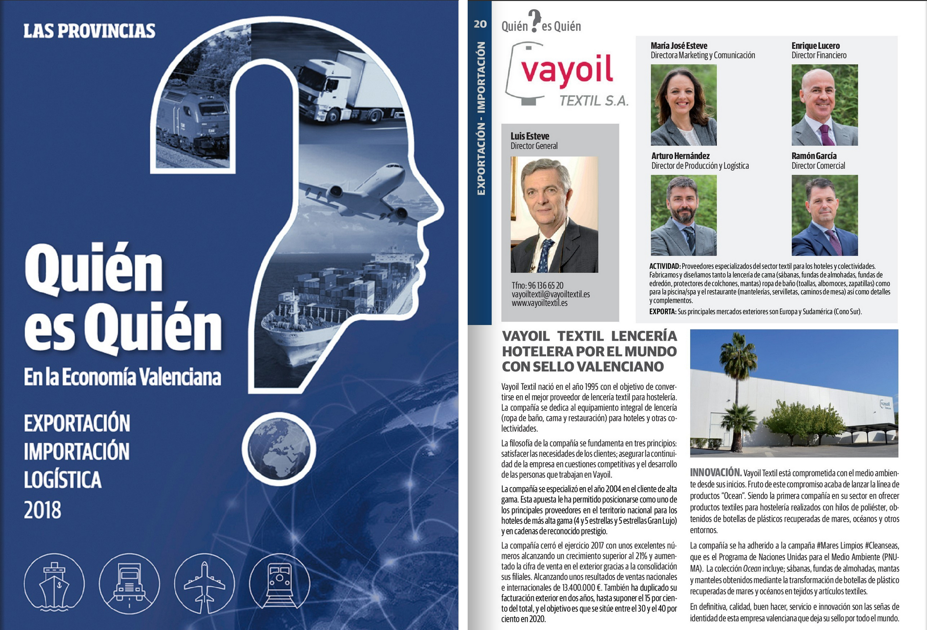 Las Provincias ha publicado su suplemento especial “QUIEN ES QUIEN” en la Economía Valenciana. Este especial contiene información de las principales empresas que Exportan desde la Comunidad Valenciana. Nuestra empresa aparece en este suplemento que recoge y pone cara a la empresas que le dan importancia a la exportación de sus productos.